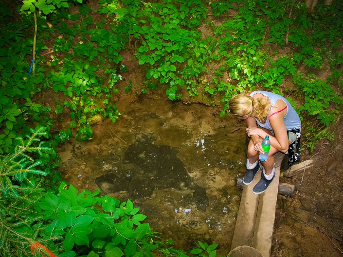 There are several tales about the holy spring, out of which one was narrated by the former inhabitant of the Kaļķlejas homestead Berta Bodniece, “They say about this spring that its water is very healthy, it never turns old, even if you keep it in a bottle the whole year. If your eyes are ill or there is some other illness, when you wash them with the water several times, they will recover. But only each time you draw water from the spring, you have to leave some token, thus in ancient times the fir-tree that is growing by the spring was covered with different belongings. Also nowadays some people go to the spring on Green Thursday to draw water, which they store the whole year. People tell legends about the spring. Once some man’s horse went lame. He brought his horse every day there and washed the ill leg; after a while the horse recovered. In ancient times even a priest used to be at the spring and prayed the God. The water in the spring is constantly purling and regularly sending yellowish sand up; the water is very chilly and clean. But the spring, they say, does not purl all the time, only if one can approach it when the spring does not see the human, but as soon as it notices you, it starts purling.” According to tales, not far from the spring there used to be a church hill destroyed during melioration works.