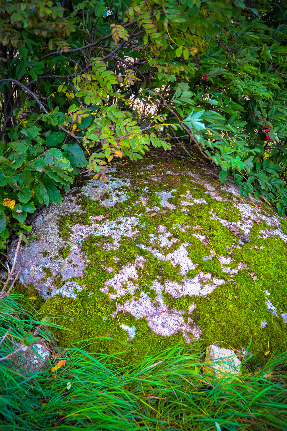 In a thick rowan bush. 3,1 m long, 2 m wide, 0,7 m high, dark grey. 4 cup-marks on a curved surface, diameter 4-6 cm, depth 0,5 – 1 cm.